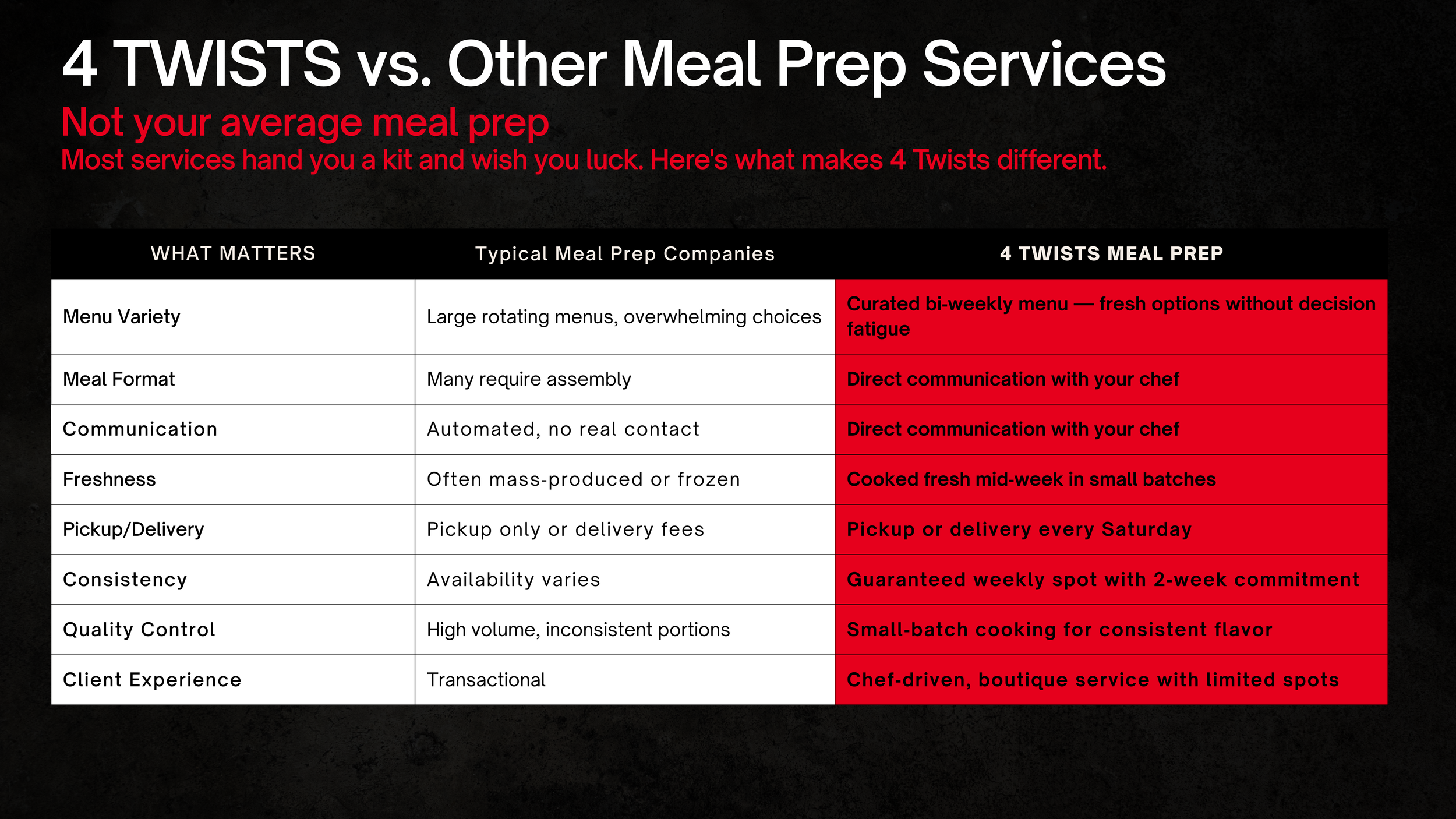 4 TWISTS is for people who want real food without the overwhelm. Every menu is intentionally curated, cooked in small batches, and prepared by a real chef — not mass‑produced or assembled from kits.